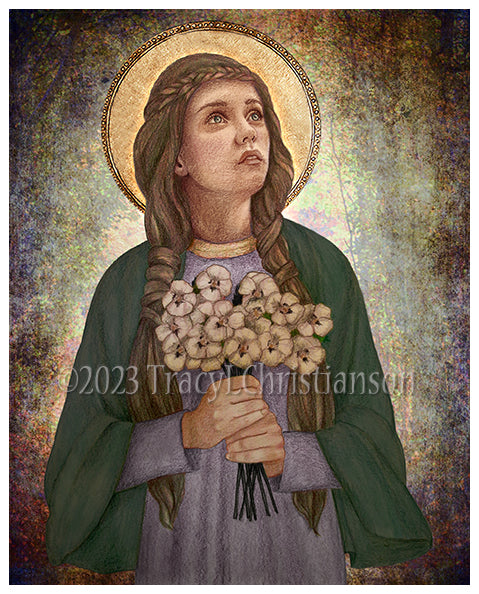 Saint Seraphina, an Italian Christian girl was a pious youth and diligent house keeper who helped her mother spin and sew.  At 10 years old, she endured the deaths of her parents and a paralyzing illness that confined her for the rest of her life on a bed made from a wooden pallet.  Devoted to St. Gregory the Great, he appeared to her to predict her death. She died as predicted on his feast day at age 15 and white violets bloomed from the pallet after her body was removed.