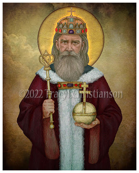 Saint Stephen I, a devout Christian king, was baptized at ten with his father, the Magyar chieftain Geza. Stephen married Gisela, daughter of Duke Henry of Bavaria and then succeeded his father as leader in 997 and devoted most of his reign to the devotion of the Christian faith. In 1000 Stephen was anointed the first king of Hungary. He established Churches, a monastery in Jerusalem for pilgrims, a system of tithes to support the Church and the poor, and abolished pagan customs. He died on August 15 after an assassination attempt and many illnesses. He was buried alongside his son St. Emeric, and the two were canonized together in 1083.