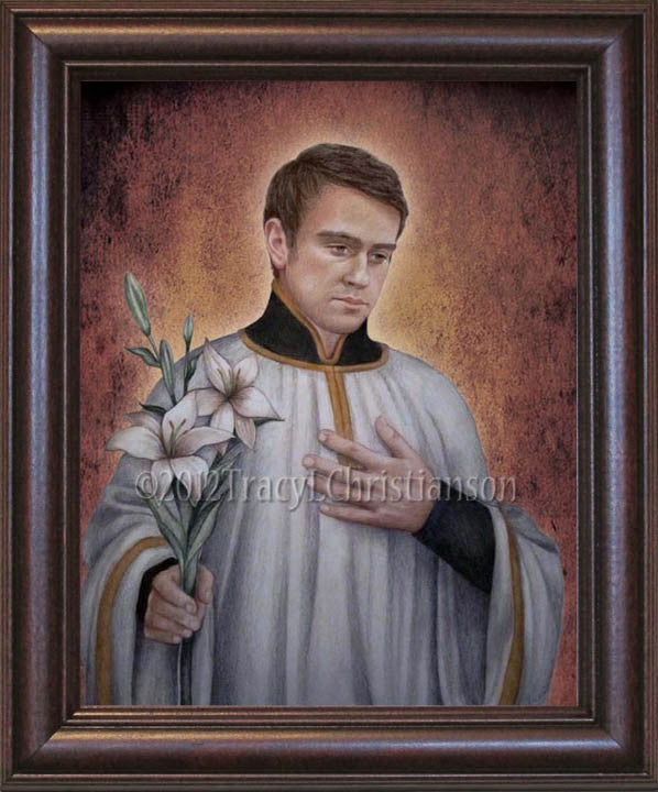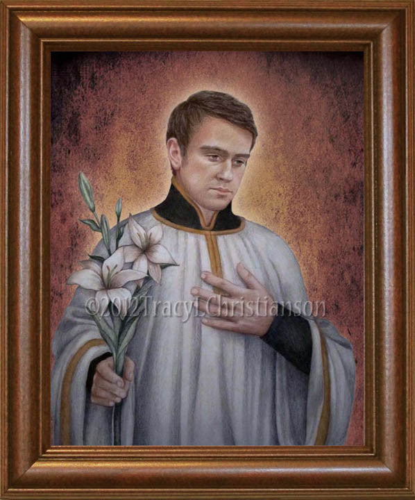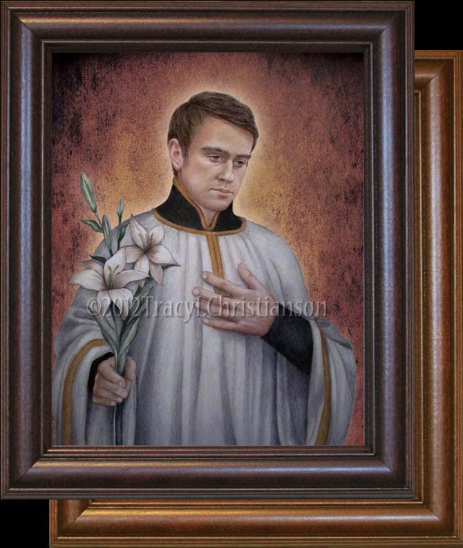 A new portrait of Saint Aloysius Gonzaga. This fine art print is professionally framed with a quality hardwood frame under non-glare acrylic. Choose from a walnut colored stain (dark wood) or speckled maple colored stain (light wood). Our frames are handcrafted from start to finish in the USA. Wall mount. A beautiful addition to any home.