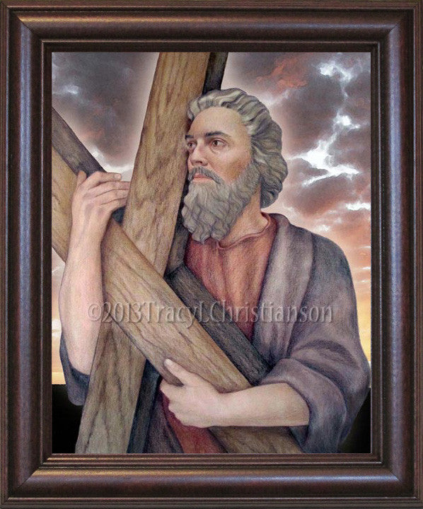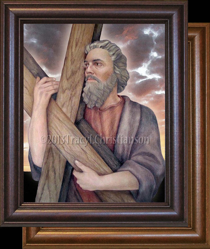 A striking portrait of Saint Andrew the Apostle. This fine art print is professionally framed with a quality hardwood frame under non-glare acrylic. Choose from a walnut colored stain (dark wood) or speckled maple colored stain (light wood). Our frames are handcrafted from start to finish in the USA. Wall mount. A beautiful addition to any home.