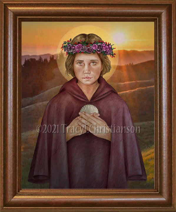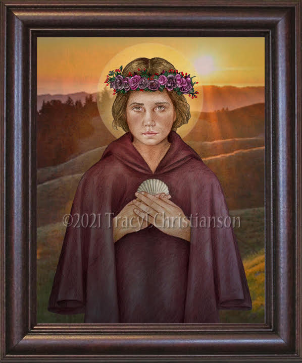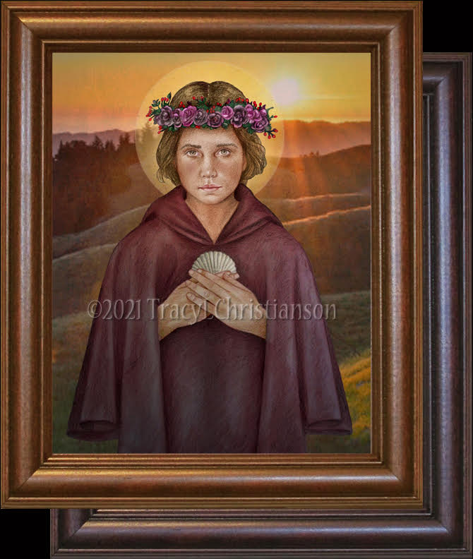 Saint Bona was born in Pisa, Italy. A child of a single mother, she experienced many visions and dedicated herself to God at the age of ten, becoming an Augustinian tertiary. At fourteen she went on a pilgrimage to Jerusalem to find her father who was fighting in the Crusades. On the way home she was captured by Muslim pirates and imprisoned and later rescued. She made many pilgrimages to the Holy Land. She had a great devotion to St. James and made the pilgrimage of St. James (Santiago de Compostela) nine times. On the tenth trip she returned home due to illness and died.
