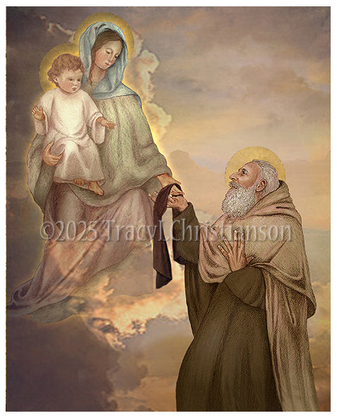 Saint Simon Stock, a Carmelite, so-called because he and other members of his order lived atop Mount Carmel in the Holy Land. St. Simon Stock was visited by the Blessed Virgin Mary on July 16th, 1251. At that time, she bestowed upon him a scapular, or habit (commonly called “the Brown Scapular”), which became part of the liturgical clothing of the Carmelite order.